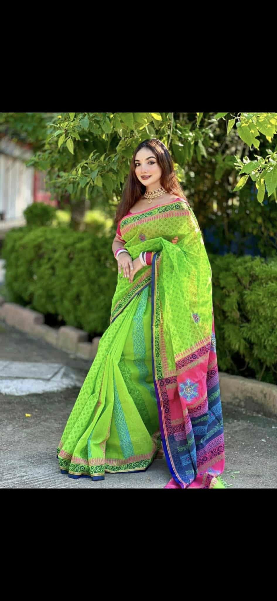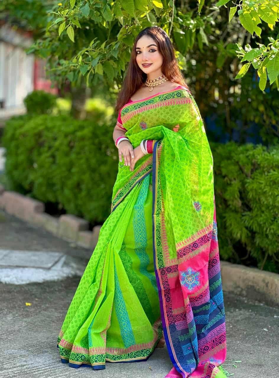 ✅ পুরো শাড়িতে আকর্ষণীয় ব্লক প্রিন্ট এবং এমবোডারি সাথে ডলারের কাজ করা।